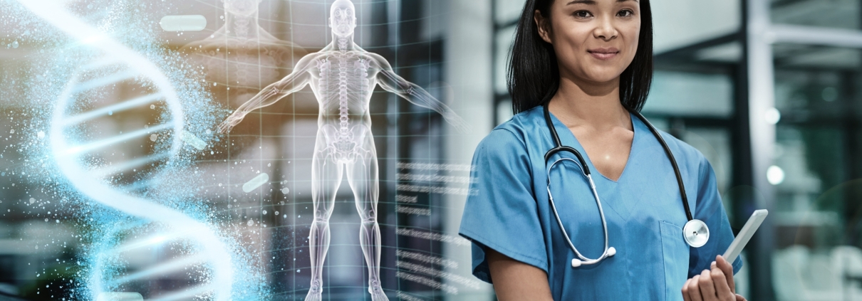 Asian nurse standing beside AI visuals